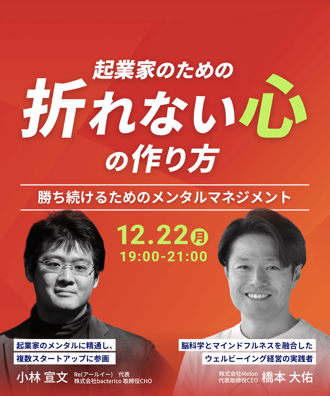 起業家としての挑戦は、心のコンディションと常に隣り合わせ。起業家や経営者のメンタル支援に長年携わってきたメンタルヘルス支援団体「Re」代表・小林宣文氏と、科学的マインドフルネスを通じて組織と個人のウェルビーイングを探求する「Melon」代表・橋本大佑氏。2人が、起業家の現場で実際に起こる“心の危機”と、その回復を支える最新のメソッドを公開。